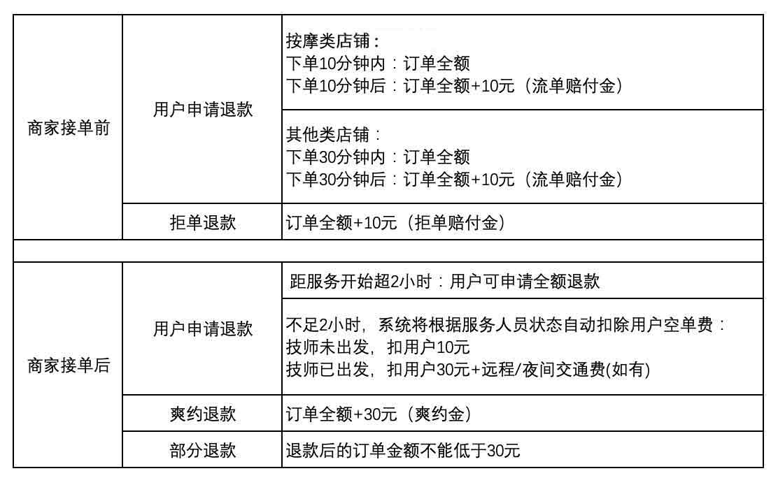 - 商家接单后,爽约退款: 商家接单后,若不能安排人员按时提供服务,除了全额退款外,需向用户额外赔付30元爽约金。