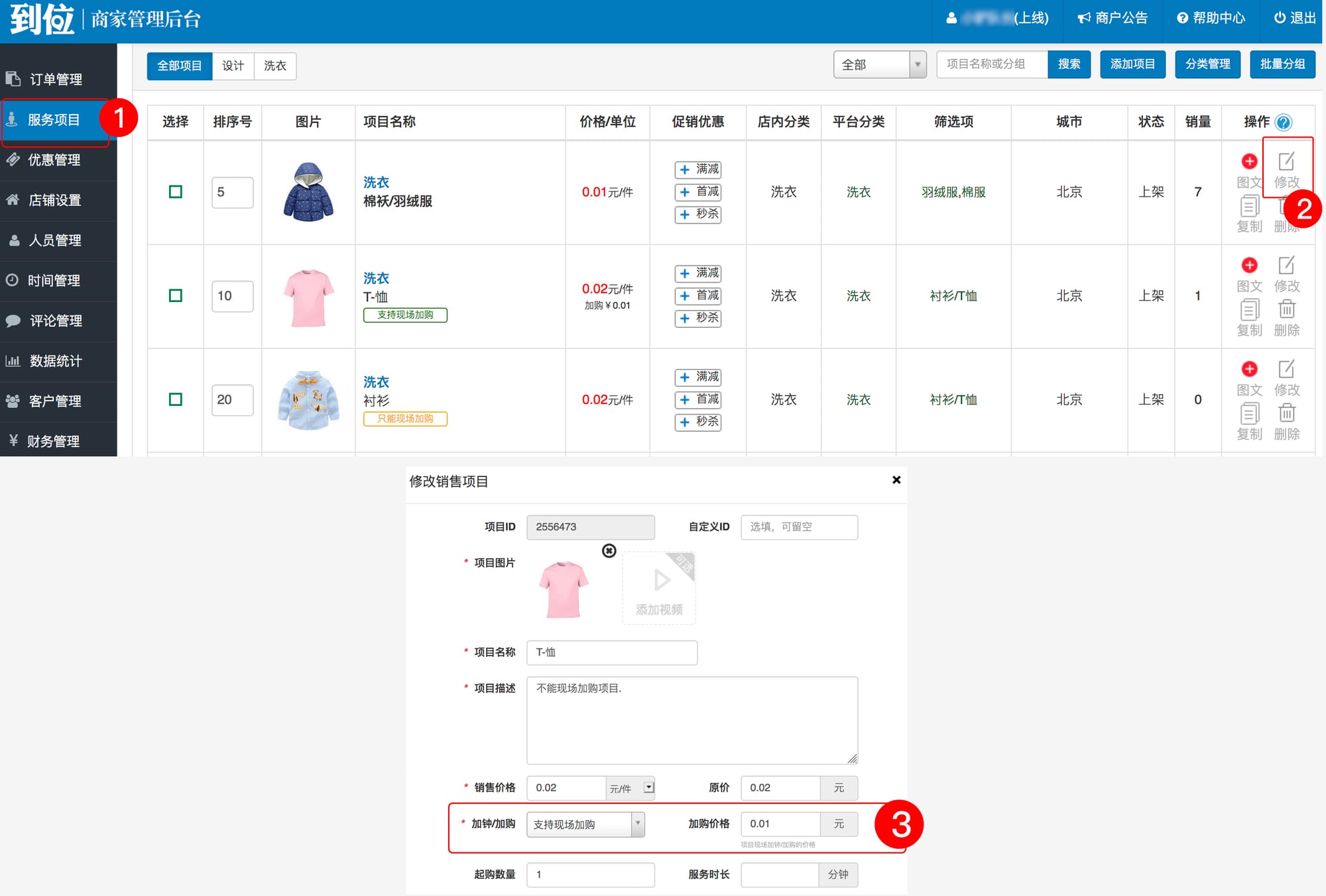 - 修改/设置项目是否支持加购,若支持,可再为项目填写“加购价格”;