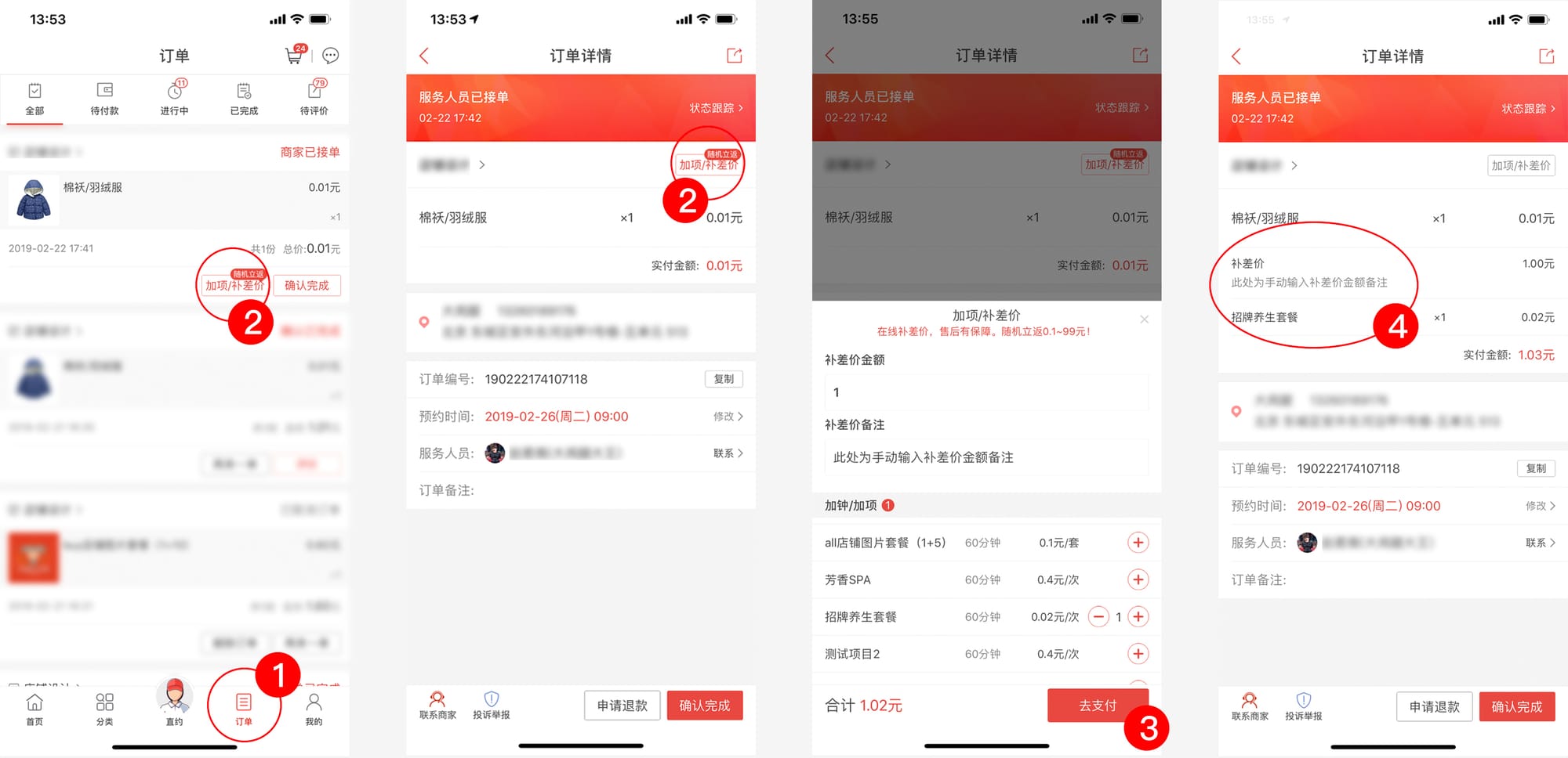 - 在订单列表或订单详情中点击“加项/补差价”按钮;